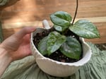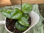 This is Hoya ‘Freckled Splash’–a variety of wax vine with large, almond-shaped leaves of dark green that exhibit heavy splashing. This sought-after “splashing” is a silvery flecking caused by air getting trapped in between the leaves, and will be most prominent if you position your ‘Freckled Splash’ in bright, indirect light. On rare occasions, when ‘Freckled Splash’ blooms, you will be greeted with clusters of pale pink flowers with red centers.