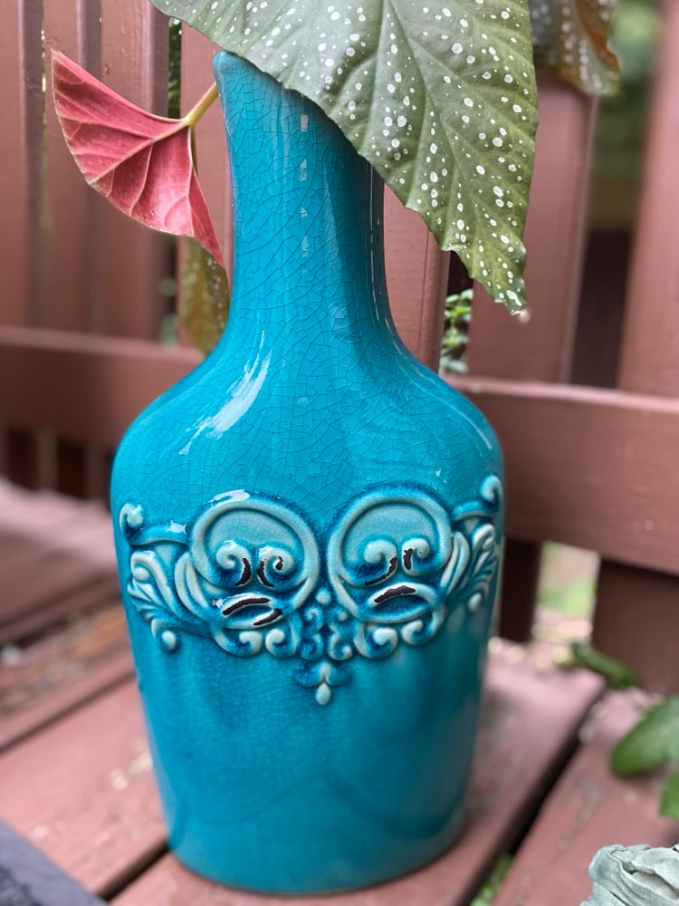 Polka Dot/ Angel Wing Begonia in Tall Teal Vase