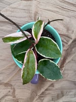 The pink variegation does not fade as leaves age. To keep her happy, give her as much bright, indirect light as possible–perhaps even some early morning sunshine! Allow the top 1-2 inches of soil to dry out completely between waterings, as they are like tropical succulents and prefer to dry out between drinks. Water thoroughly by soaking the soil until water drains from the drainage hole, then empty any excess water from the saucer to prevent root rot. This variety of hoya is primarily grown for her steadfast pink variegation, but she may also bloom with cream-to-pink flowers.