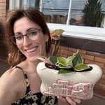 The pink variegation does not fade as leaves age. To keep her happy, give her as much bright, indirect light as possible–perhaps even some early morning sunshine! Allow the top 1-2 inches of soil to dry out completely between waterings, as they are like tropical succulents and prefer to dry out between drinks. Water thoroughly by soaking the soil until water drains from the drainage hole, then empty any excess water from the saucer to prevent root rot. This variety of hoya is primarily grown for her steadfast pink variegation, but she may also bloom with cream-to-pink flowers.